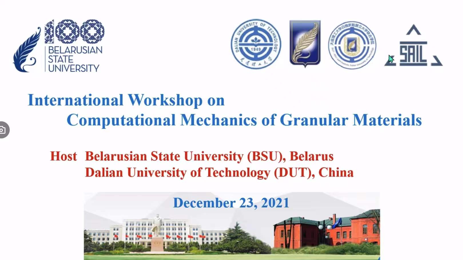 2021年12月23日,颗粒材料计算力学国际学术研讨会(International Workshop on Computational Mechanics of Granular Materials)在线上召开。本次大会由大连理工大学和白俄罗斯国立大学共同主办,中白学院、中白科创中心承办,旨在为国内外学者在颗粒材料计算力学领域的深度交流与国际合作提供一个全新的学术平台。