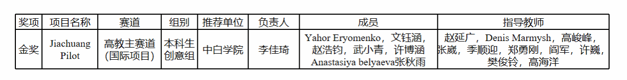 2023年12月3日至6日,中国国际大学生创新大赛(2023)总决赛在天津大学举办。中白学院参赛项目“Jiachuang Pilot”获得大赛金奖(辽宁省国际赛道首金),刷新了学院在此项赛事上的最好成绩,我校首次在高教主赛道国际参赛项目中取得金奖突破!至此,中白学院在此项赛事共夺得1金2银2铜。