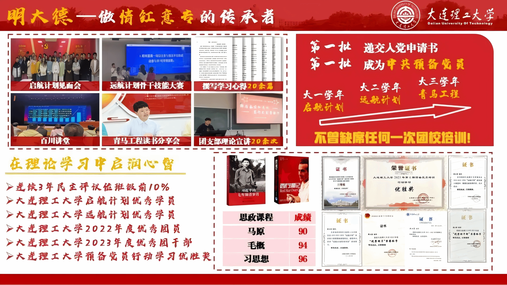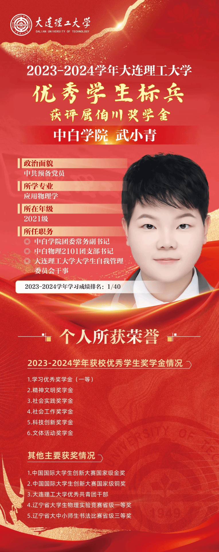 大连理工大学2023-2024学年优秀学生标兵评选活动于近日落下帷幕,获评大连理工大学2023-2024学年优秀学生标兵称号,同时获得2023-2024学年“屈伯川奖学金”。