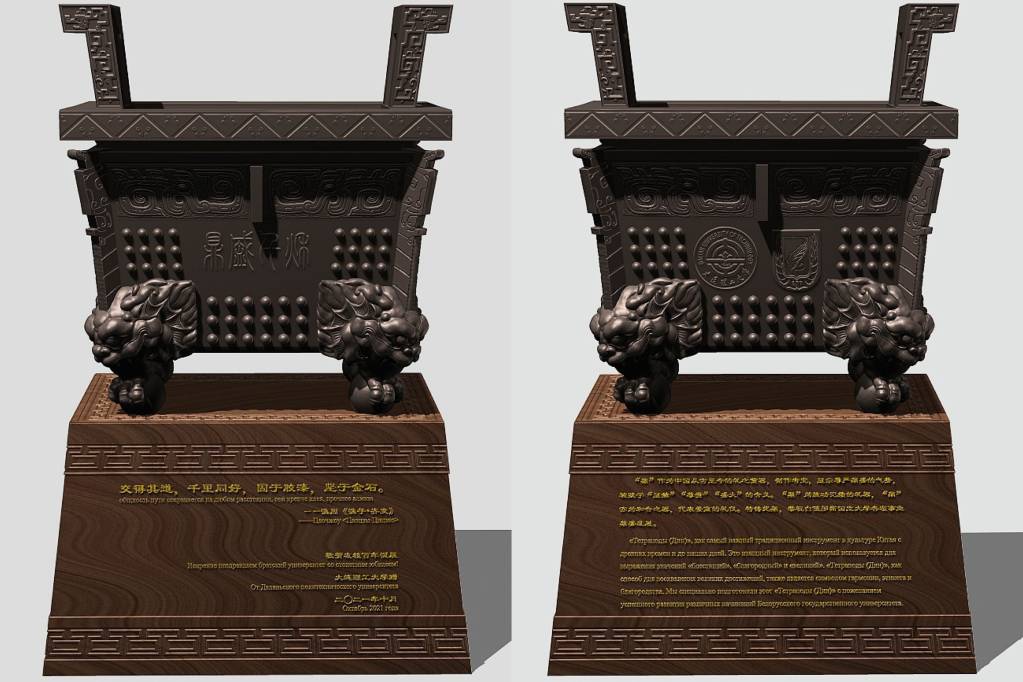 Professor Deng Wei of the School of Architecture and Fine Arts specially designed a replica of the traditional Chinese“Ding”as a congratulatory gift for BSU's centenary. "Ding" is a ceremonial vessel for recording achievements, as well as a vessel for harmony, representing lofty etiquette. With this present,DUT wishes BSU a prosperous development in all undertakings.