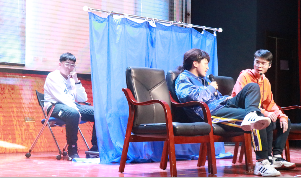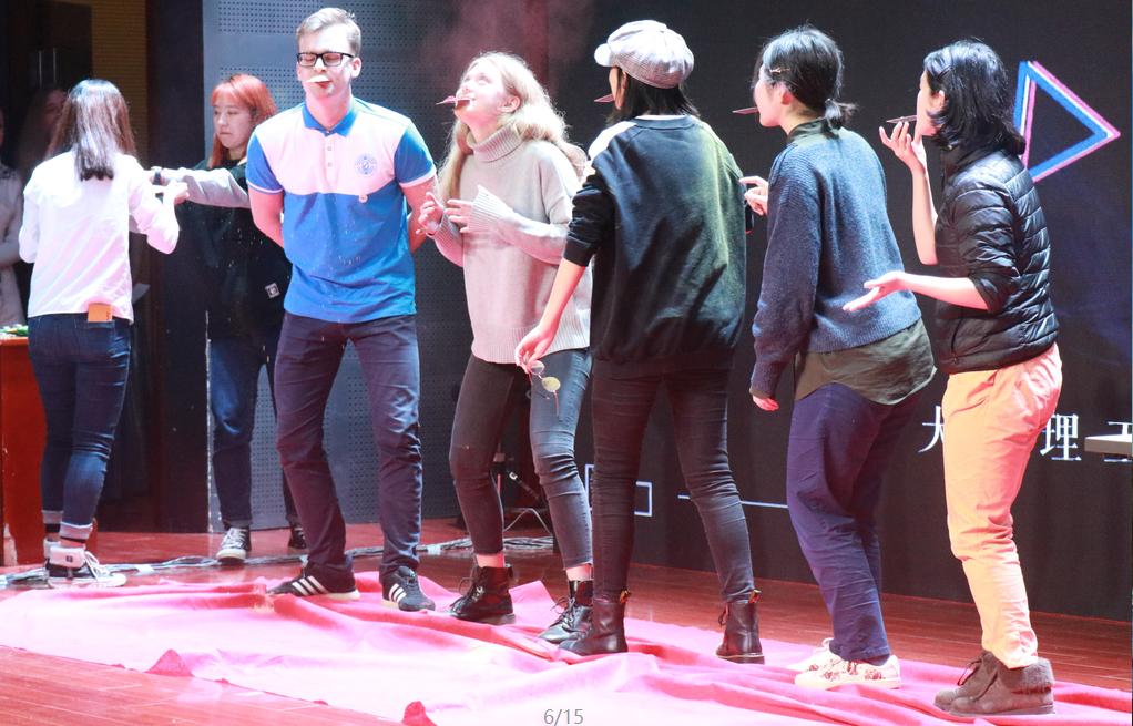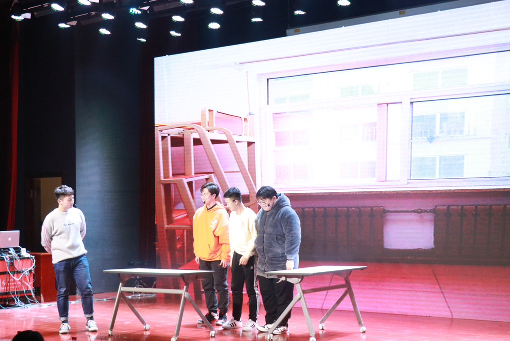 为活跃现场气氛,晚会特别准备了小游戏环节,第一个游戏是传面粉,用嘴控制扑克牌传递面粉,在规定时间内传递面粉数量最多的一组获胜。彩色面粉被同学们吹的漫天飞舞,台下的观众忍俊不禁。第二个活动是配音,三位选手在听过原声后对照消声视频模仿出来,由观众的呼声来决定胜负,选手们模仿的声音引得台下观众捧腹大笑,前仰后翻。现场观众通过扫描二维码,发布弹幕,后台随机抽取幸运观众。