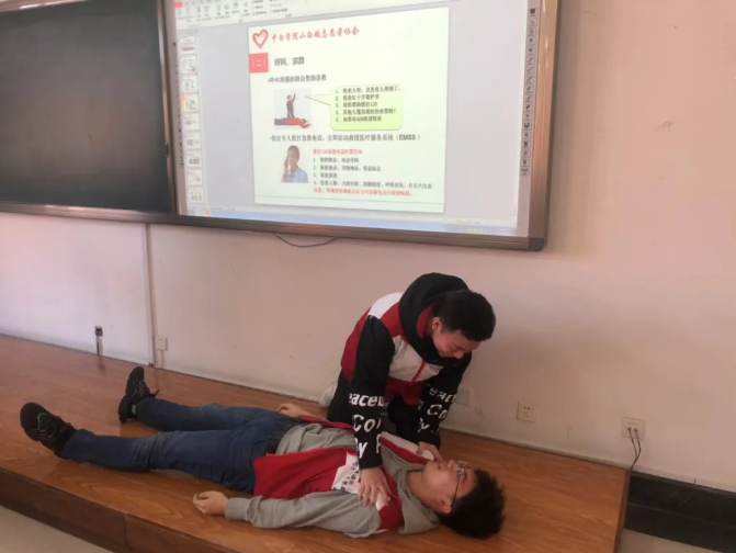 在中国,因心脏骤停而死亡的人数常年居高不下。针对这一问题,我们本次活动重点之一就是教大家心脏复苏术。由志愿者姚家骏和赵浩钧为大家演试在现实生中遇到路人心脏骤停的情况该如何面对。让同学们更加深刻体会,心脏骤停时,时间就是生命,如果我们能够牢记心脏复苏术实施步骤,就有更大几率拯救患者生命!