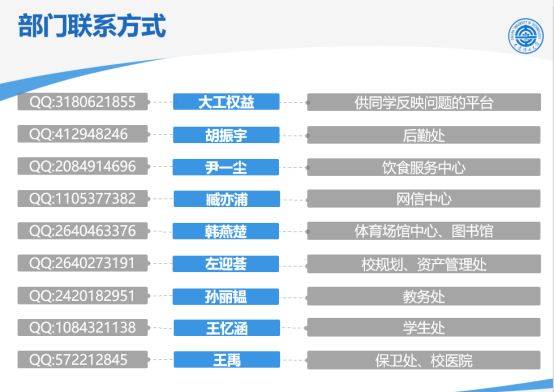 会议主要对学生在校期间可能遇到的问题给出了解决方案。宣讲内容包括:介绍学校各个部门的功能以及联系方式。本次宣讲会分别介绍了后勤处、资产管理处、网信中心、图书馆、保卫处、学生处、体育场馆中心、教务处、校规划与管理办公室、校医院十个职能处。以下为学校各部门的联系方式。