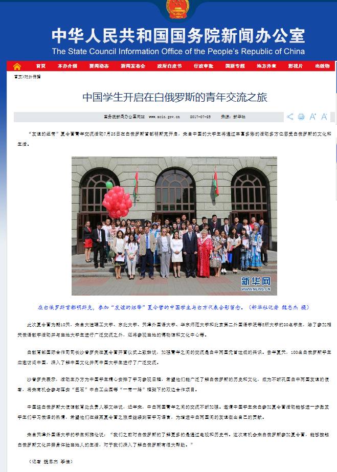 据悉,本次夏令营根据白俄罗斯总统卢卡申科2016年9月28–30日和11月18日访华30号备忘录,为了促进中白两国学生校际交流,更好地了解白俄高校的科研实力和办学优势以及明斯克的城市文化,近距离与白俄老师交流而成立。白俄罗斯教育部国际合作司司长沙普罗夫,中国驻白俄罗斯大使馆教务处负责人李文华以及来自白俄罗斯国立大学,白俄罗斯国立技术大学,明斯克语言大学校领导参与开营仪式。新华社报道本次夏令营,国务院新闻办公室,新浪网相继转载。
