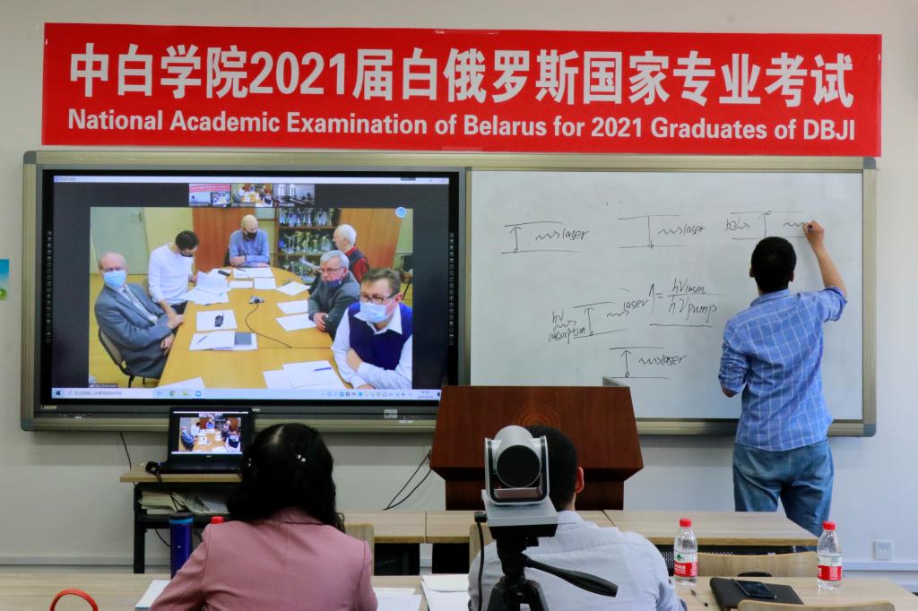 5月21日,中白学院2021届应用物理和工程力学专业的全体毕业生结束了为期四天的白俄罗斯国家专业考试,考试以远程面试的方式进行。中白学院邀请到了运载工程与力学学部和物理学院的十位专业教师作为中方考官在现场对毕业生们进行全英文考核。考生们沉着冷静、信心十足,有条不紊地按照考试规则书写答案并细心讲解。期间,中白学院院长季顺迎前往现场进行考察,为考生们加油鼓气。