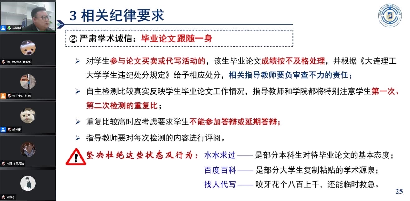 会上,高峻峰首先强调了毕业设计(论文)的重要意义以及各个时间节点的任务内容,并结合往届毕业生情况给出相关的建议和提醒,让与会同学们意识到毕业设计(论文)工作的严肃性与重要性。随后,结合学校毕业设计(论文)工作的管理办法,高俊峰详细介绍了《任务书》、《外文翻译》和《毕业论文》的完成要求,指出并分析了以往常见的问题,重点强调了毕业设计(论文)杜绝抄袭以及论文查重的相关规定。