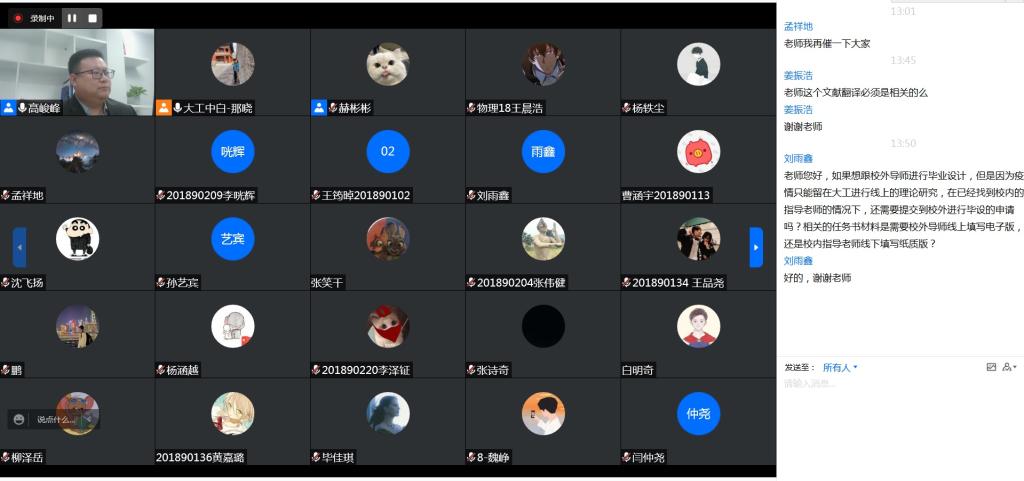 最后,高峻峰鼓励学生要努力刻苦,抓紧时间。面对疫情对毕业设计的不利影响,他和学生探讨了可能的困难,建议毕业生把毕业设计工作往前赶,抓紧学习工作时间,尽早开展、主动与导师有效沟通,注意规避风险。遇到一切困难,提前向学院教务人员反应,早沟通,早解决。