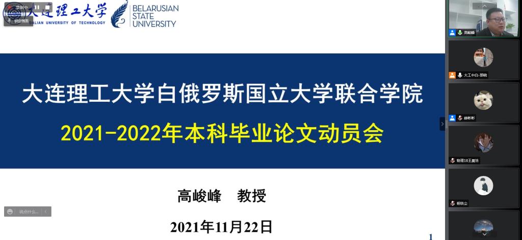 面对疫情带来的特殊形势,为了帮助同学们规范论文写作,按照学校毕业设计(论文)工作统一安排,11月22日,中白学院2022届本科毕业设计(论文)动员大会以腾讯会议直播形式顺利举行。中白学院教学负责人高峻峰教授为全体2022届本科预毕业生做了毕业设计(论文)相关政策的解读及任务说明。