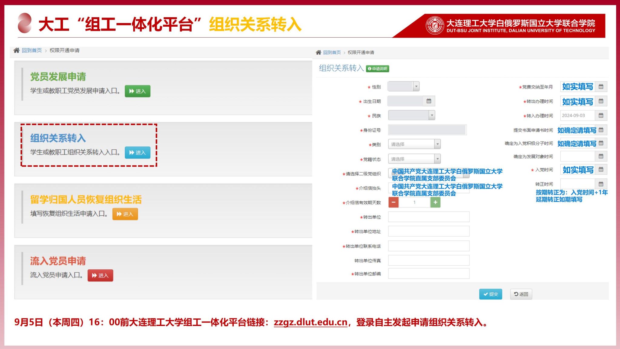 1、申请组织关系转入。9月5日(本周四)16:00前,登录大连理工大学组工一体化平台(链接:zzgz.dlut.edu.cn),并填写相关信息,具体操作页面见图示。中白学院本科毕业生学生、中白学院硕博连读同学无需发起转入组织关系。