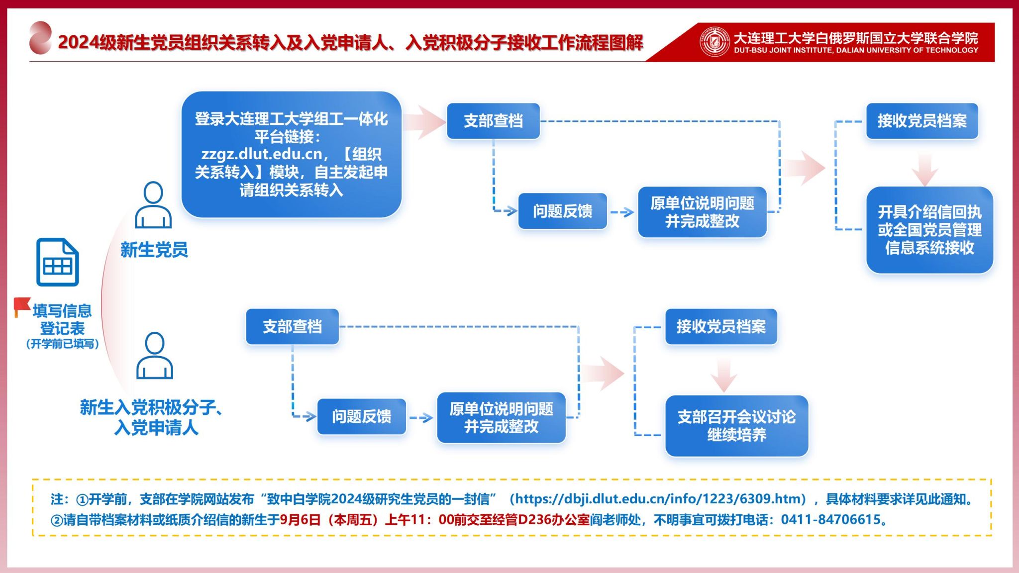 欢迎大家进入大连理工大学白俄罗斯国立大学联合学院(中白学院)进行学习,为顺利开展新生党员组织关系转入及入党申请人、入党积极分子接收培养工作,请大家仔细阅读工作说明,并在截止时间前按要求认真完成,整体工作流程如下。